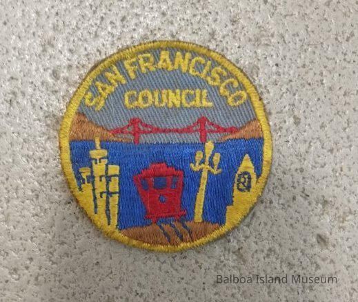 A circular merit badge for the San Francisco Council of the boy scouts of america. The badge shows a cable car (red) going down a track twoards teh golden gate bridge and the bay.