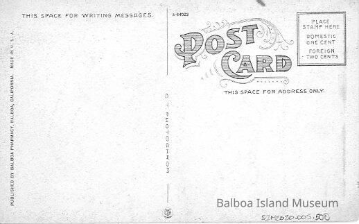 Unused. Published by Balboa Pharmacy in Balboa and made in the USA. Printed by Curteich-Chicago (C. T. Photochrom) in Chicago. Postcard number A-84023. Stamp box reads "Place Stamp Here Domestic One Cent Foreign Two Cents" inside a triple solid frame.Subject