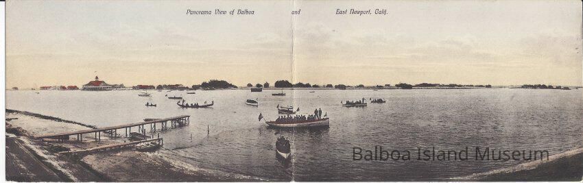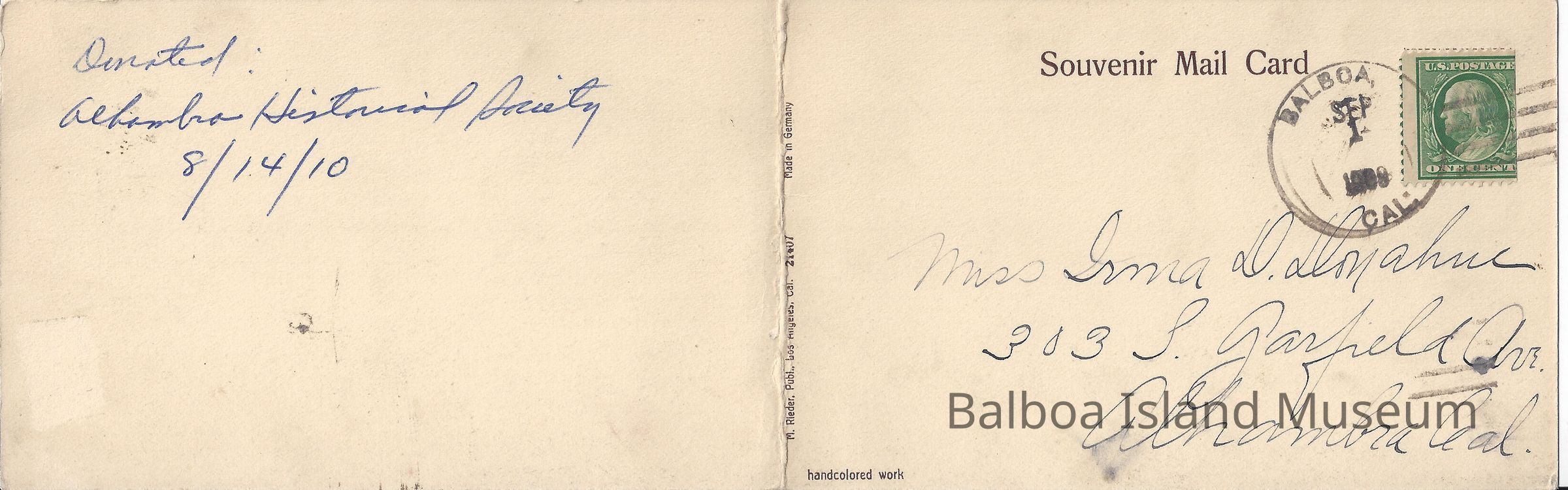 Long B&W postcard with panoramic view of Balboa and East Newport. Reverse says: Donated: Alhambra Hstorical Society 8/14/10. Card is addressed and postmarked with 1 cent stamp. Printed handcolored work Made in Germany