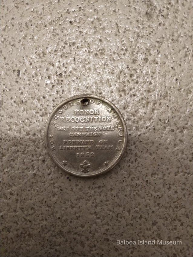 A small commemorative coin given out as part of the Get out the vote campaign the Boy Scouts ran in 1952. The coin, referred to on the front as the George Washington metal issued by Freedoms Foundation, Inc. from Valley Forge, PA, has a picture of George Washington on the front and on the back reads: Honor Recognition "Get out the Vote" campaign forward on liberty's team 1952.Context