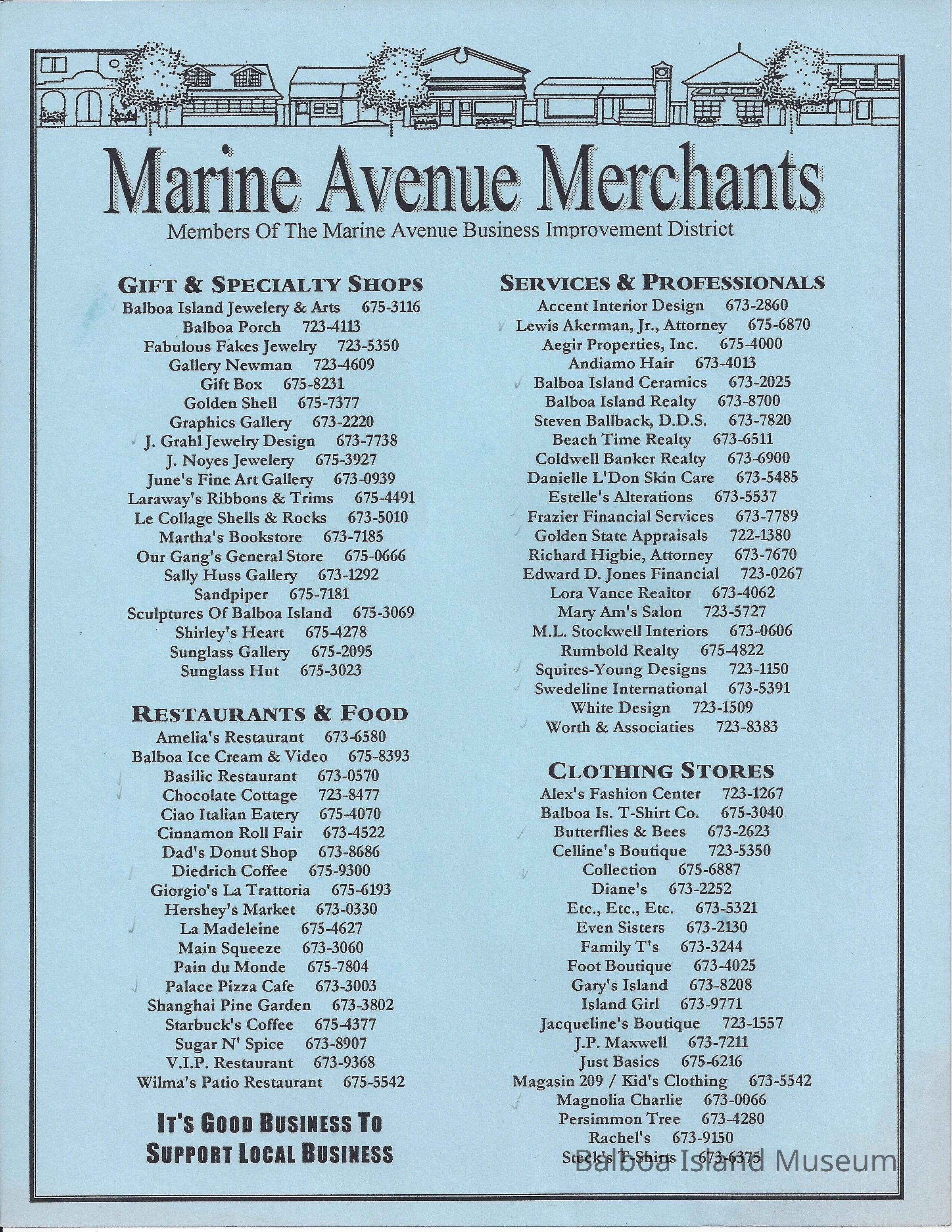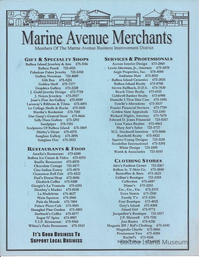 Balboa Porch, Fabulous Fakes, Gallery Newman, Gift Box, The, Golden Shell, Graphics Gallery, J. Noyes Jewelry, June's Fine Art Gallery, Laraway's Ribbons & Trims, Le Collage Shells & Rocks, Martha's Bookstore, Our Gang General Store, Sally Huss Gallery, Sandpiper, The, Sculptures of Balboa Island, Shirley's Heart, Sunglass Gallery, Sunglass Hut, Amelia's Restaurant, Balboa Ice Cream Factory, Ciao Italian Eatery, Cinnamon Roll Fair, Dad's Donut Shop, Giorgio's La Trattoria, Hershey's Market, Main Squeeze, The, Pain Du Monde, Shanghai Pine Garden Restaurant, Starbuck's Coffee, Sugar N Spice, V.I.P., Wilma's Patio Restaurant, Accent Interior Design, Aegir Properties, Andiamo Hair, Balboa Island Realty, Ballback DDS, Steven, Beach Time Realty, Coldwell Banker Realty, Danielle L'Don Skin Care, Estelle's Alterations, Higbie, Richard, Edward D. Jones Co, Lora Vance Realtor, Maryam's Salon, M. L. Stockwell Interiors, Rumbold Realty, White Design, Alex's Fashion Center, Apolena Avenue, 305, Balboa Island T-Shirt Co., Celline's Boutique, Diane's, Etc. Etc. Etc, Even Sisters, Family T's, Foot Boutique, Gary's Island, Island Girl, Jacqueline's Boutique, J. P. Maxwell, Just Basics, Magasin 209, Kid's Clothing, Magnolia Charlie, Persimmon Tree, The, Rachel's, Steck's T-Shirts, J. Grahl Jewelry Design, Balboa Island Jewlery & Arts, Basilic Retaurant, Chocolate Cottage, Diedrich Coffee, La Madeleine, Palace Pizza Cafe, Akerman Jr, Lewis, Balboa Island Ceramics, Frazier Financial Services, Golden State Appraisals, Squires-Young Designs, Swedeline International, Worth & Associates, Butterflies & Bees, Collection, Marine Avenue, Marine Avenue Business Improvement District