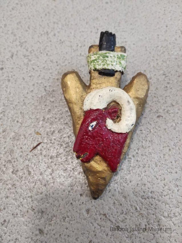 A neckerchief slide from the Big Horn Camp area. It is shaped like an arrowhead with a large red ram with white horns on the front. Made from resin.Lexicon