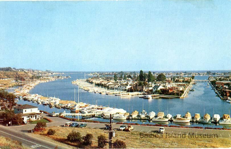 A photograph of Little island and grand canal taken from the hills above bayside. The yacht storage facility across from the island is visible in the foreground. The island is identical to BIM2020.005.130 except the location of a few cars.