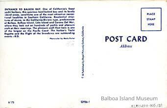 Unused. There is a blurb in the upper left corner on the back written by R. D. Photograph by Merle Porter and published by Royal Pictures. Postcard number B 173 and print number S2936-1. Postcard addressed to J. W. Nisson in Jamestown, New York. Sent from Huntington Beach Post Office in 1952.Subject