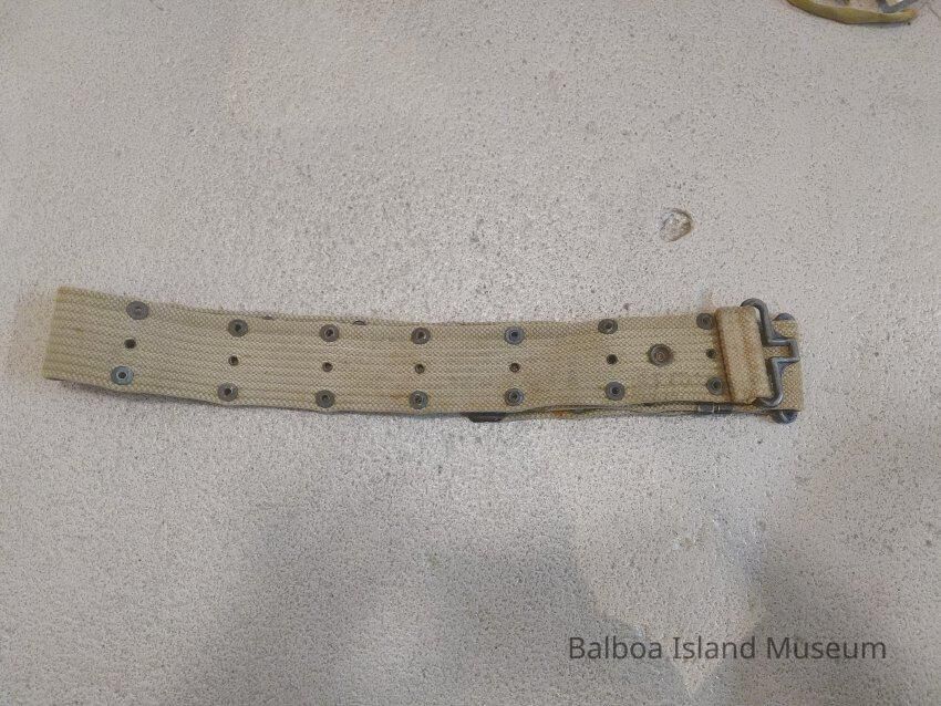 A borken belt made from green canvas with metal rivet reinforced holes and a hook on one end to hold the belt shut. Part of a scouting uniform.Lexicon