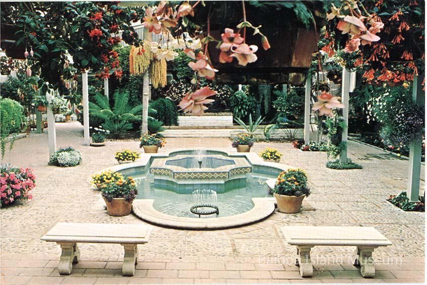 A color photograph postcard of an indoor fountain surrounded by benches inside a wood slat building. May have been taken inside the specimen shade garden or the tropical conservatory.