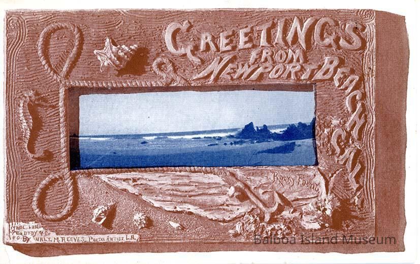 A postcard with a stylized block surrounding an image of Rocky Point in Corona del Mar. The block has an anchor, seashells, star fish and a number o other things embedded or carved in it. It might have been made from clay and photographed. According to the bottom left corner on the front, the cards were made for Peabody & Co. by Walt. M. reeves who was a portal artist in LA. The image n the middle is Rocky Point in Corona del Mar according to some writing below the image. The words "Greetings from Newport Beach Cal." are carved in the upper right corner.
