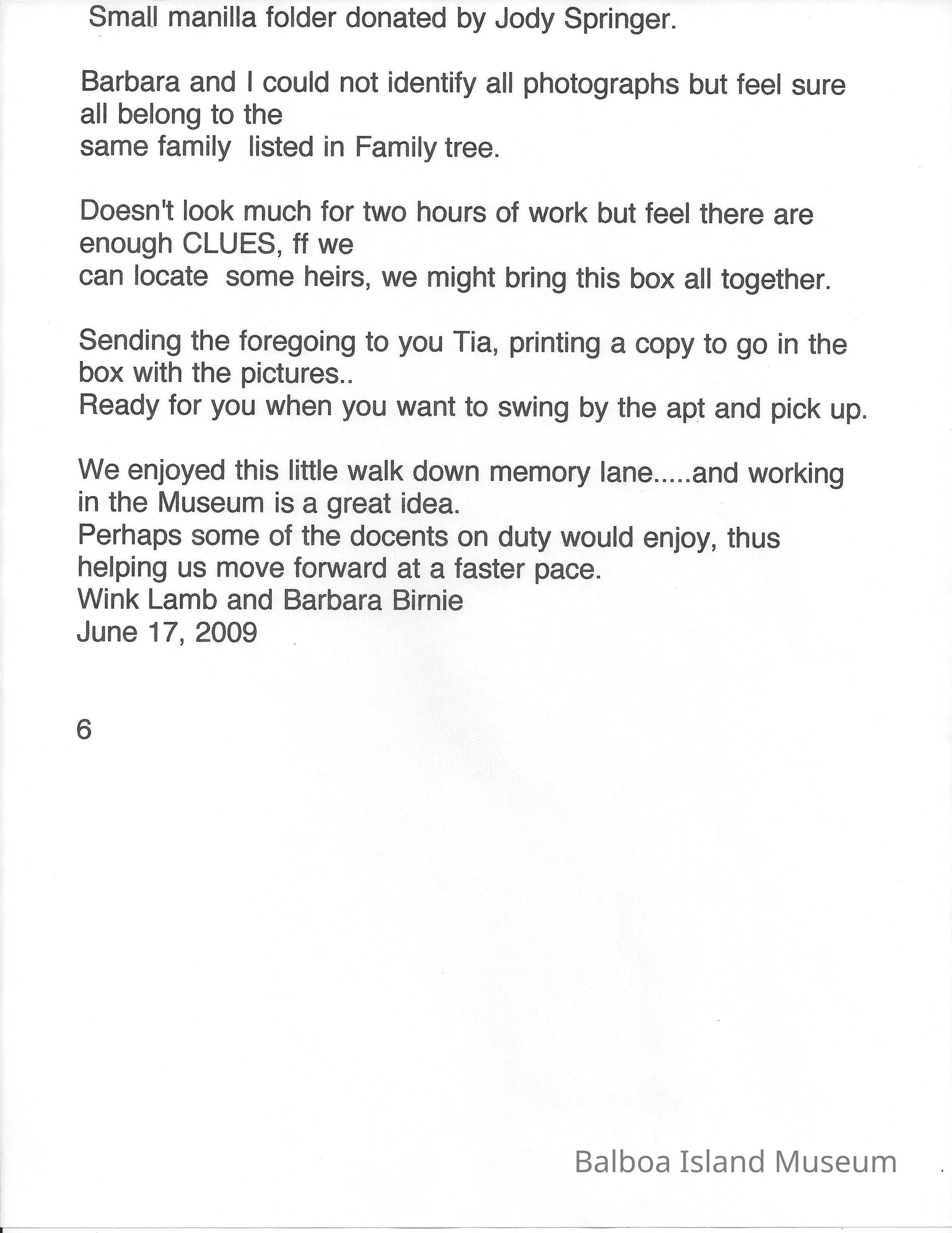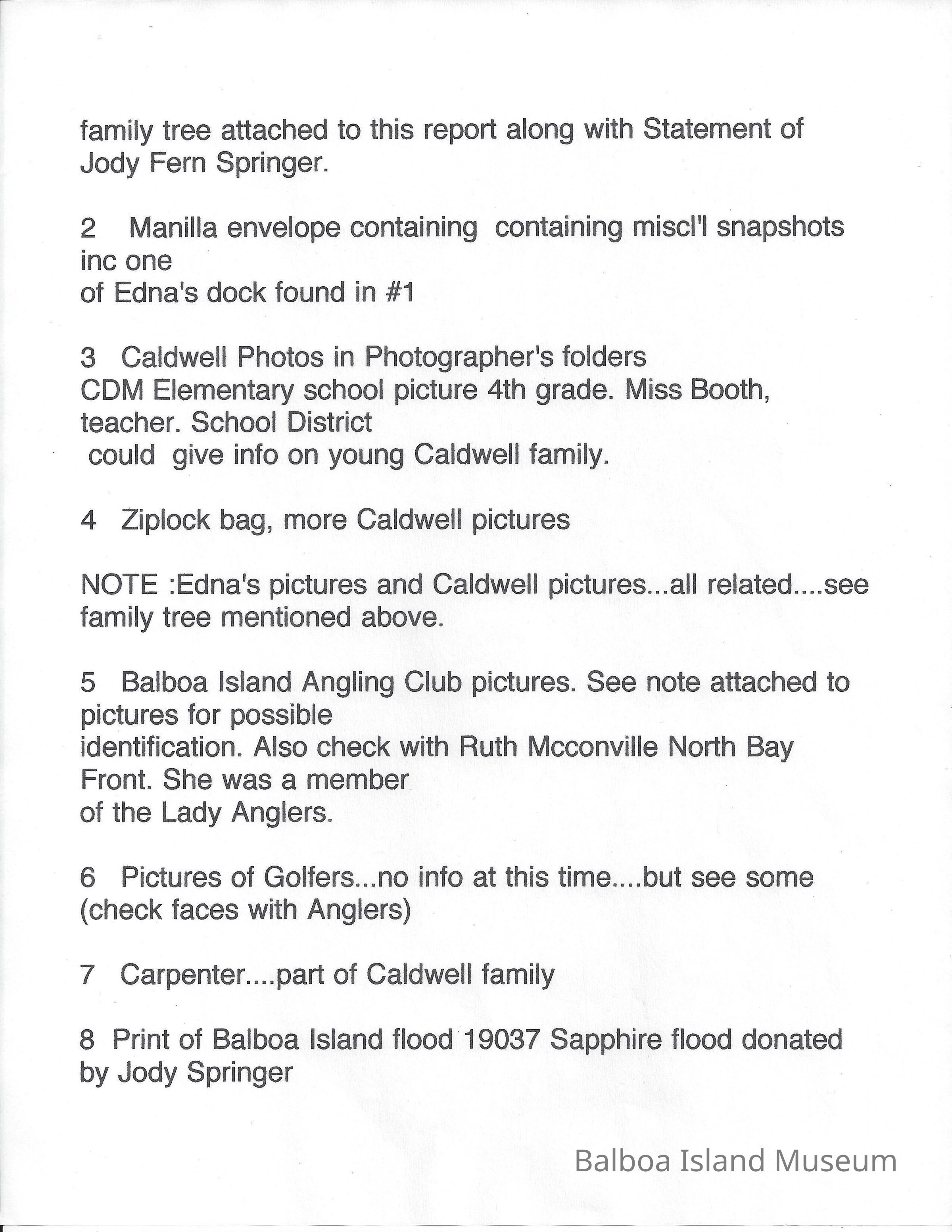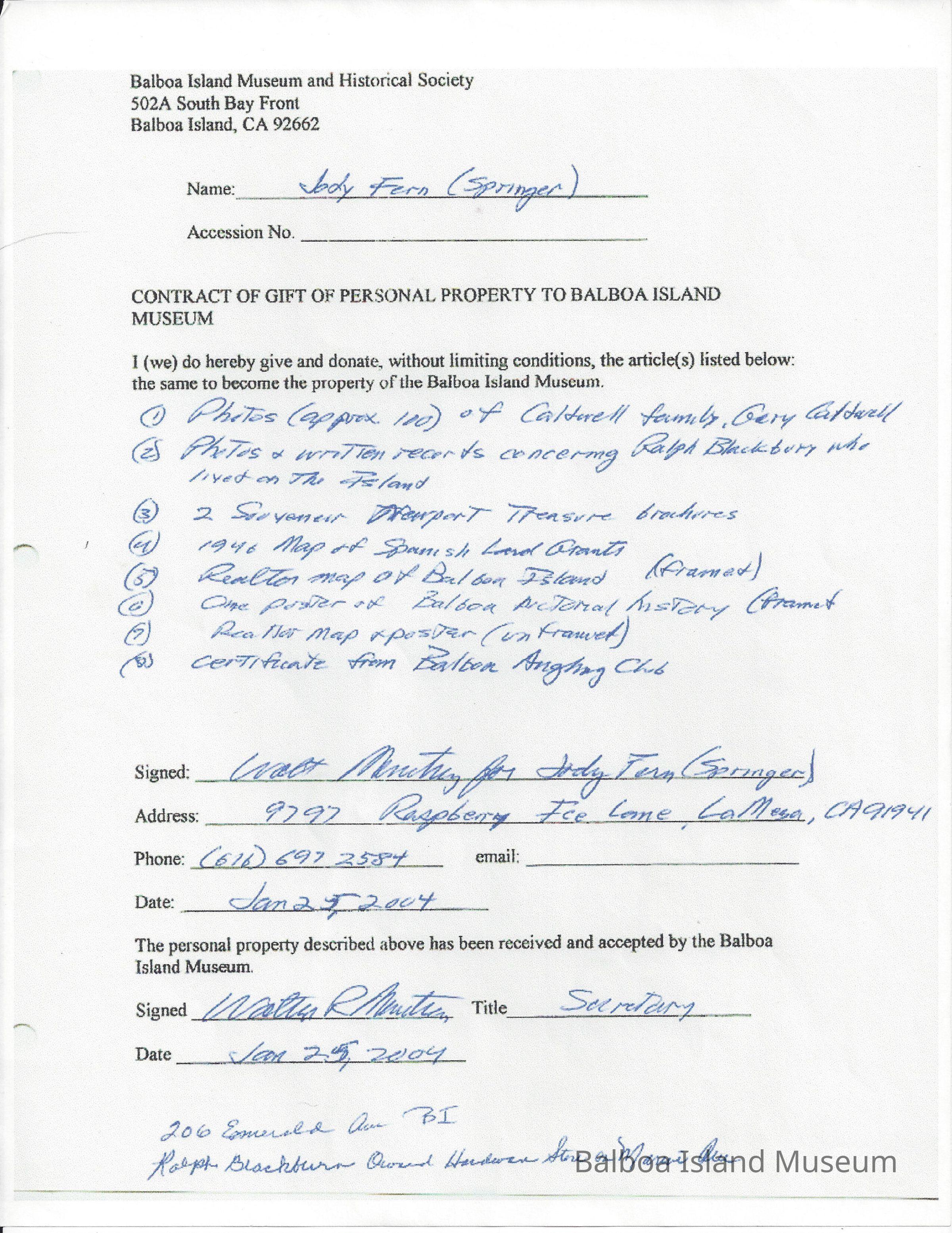 BIMHS Accession form. Only a small portion of photos and artifacts are catalogued but all items kept under this Object ID range.Collection