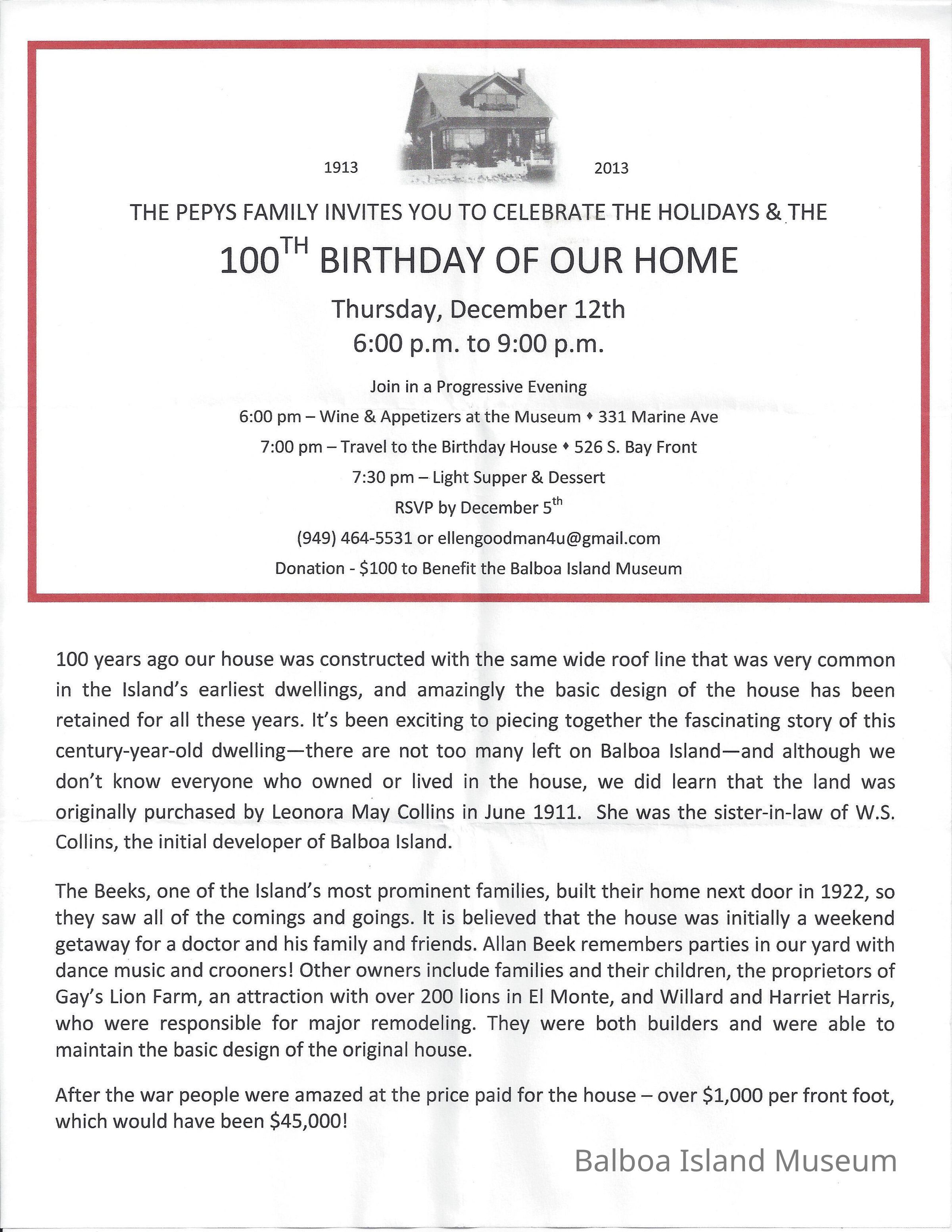 Invitation to 100th birthday party for home of Shirley Pepys at 526 South Bay Front