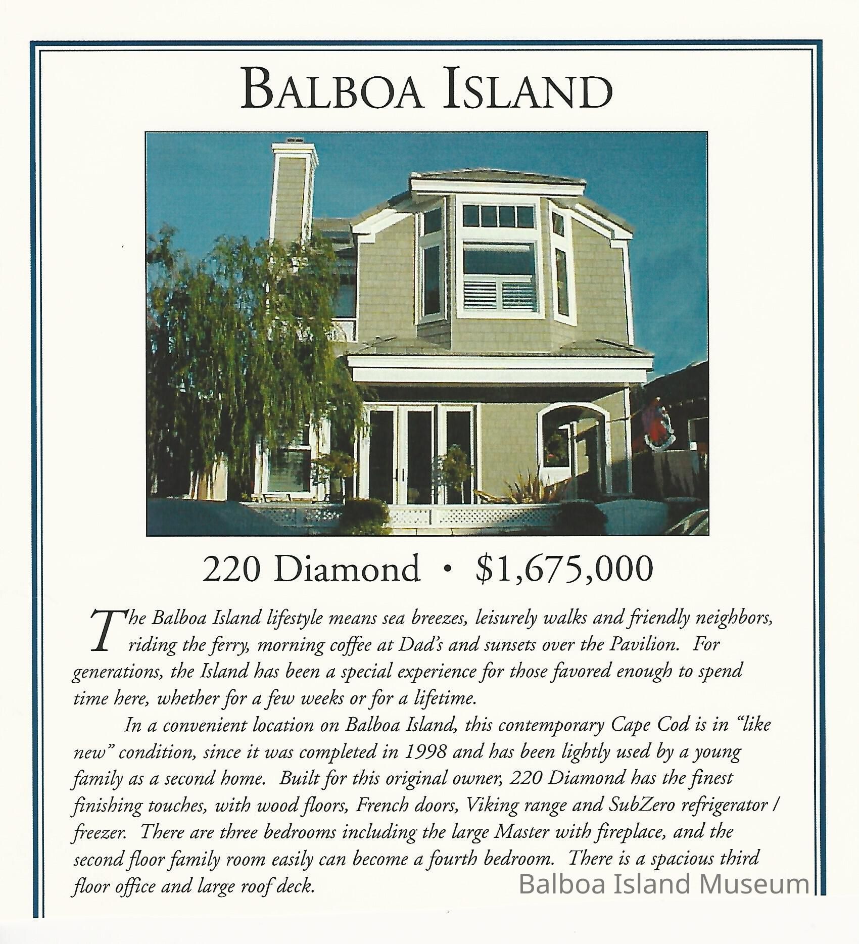 A real estate flier about 220 Diamond Avenue collected by Alice Brownell during her time with Balboa Island Realty.Collection