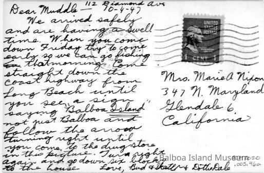 We arrived safely and are having a swell time. When you come down Friday try to come early so we can go fishing that morning. Come straight down the coast highway from Long Beach until you see a sign saying "Balboa Island" not just Balboa and follow the arrow turning right until you come to the drugstore in this picture. Turn right again and go down six blocks to the house.