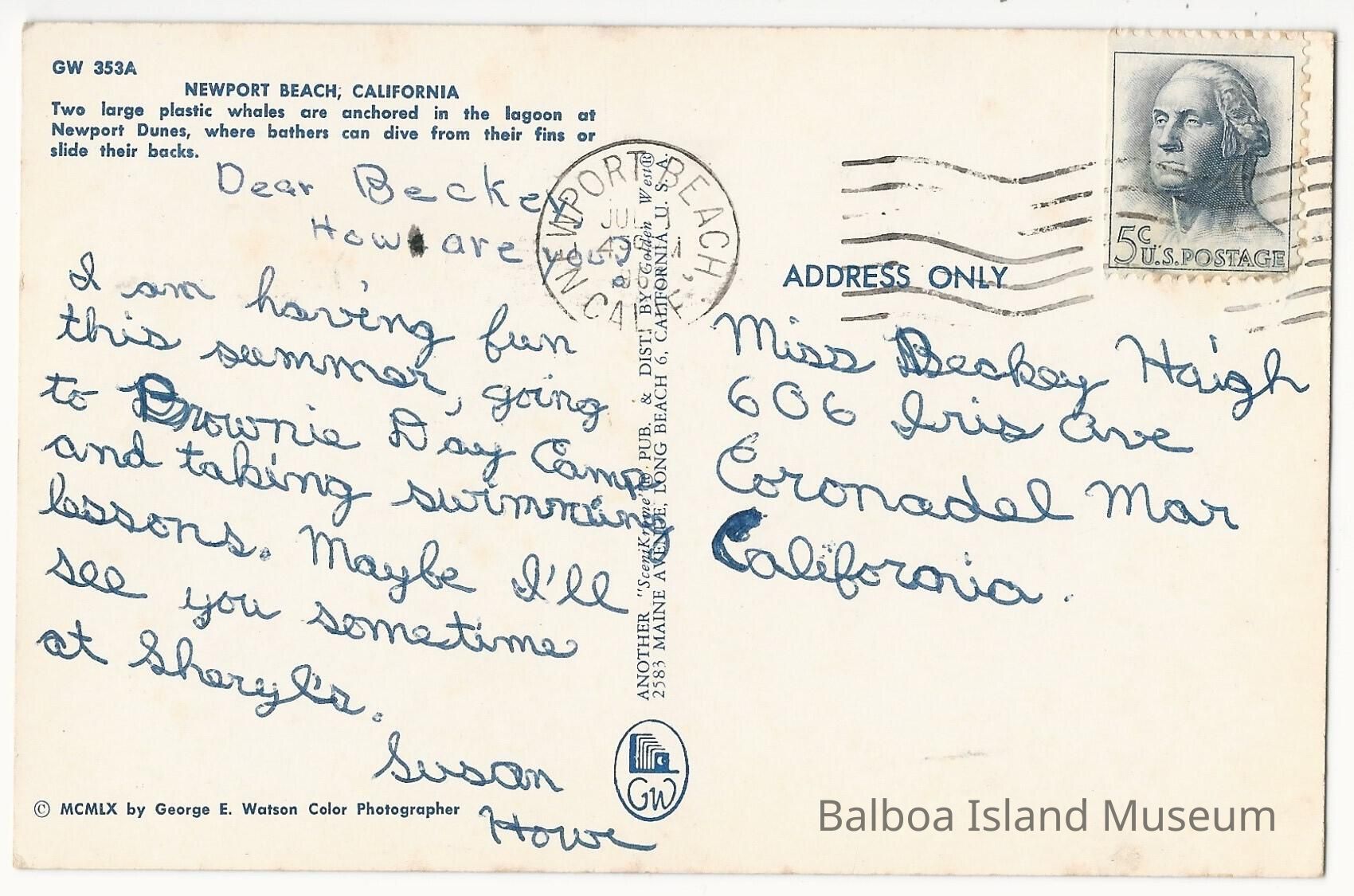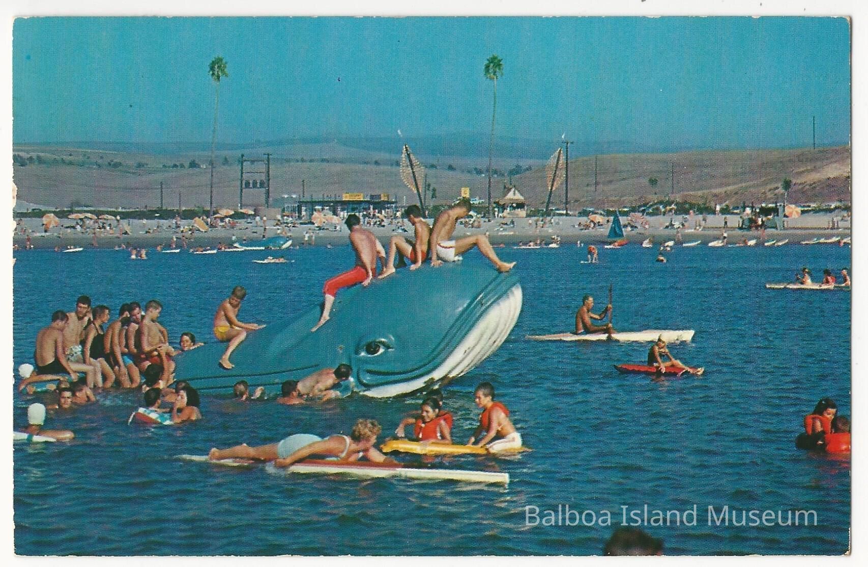 A postcard with a color photograph of Newport Dunes area and the whale. Several kids are sitting on the whale in the photograph along with man people on boards surrounding it. The post card was wsent July 1963. The photograph is copyright 1960.