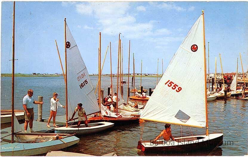 A color postcard of several people along the docks preparing small sailboats, likely Snowbirds, for racing. Might be the Newport Harbor docks or the Balboa Yacht Club docks.