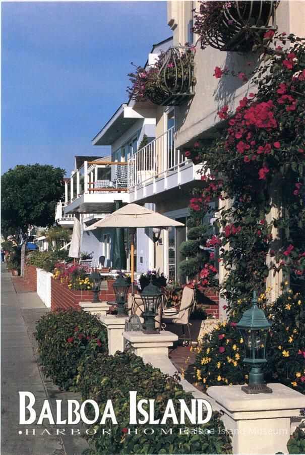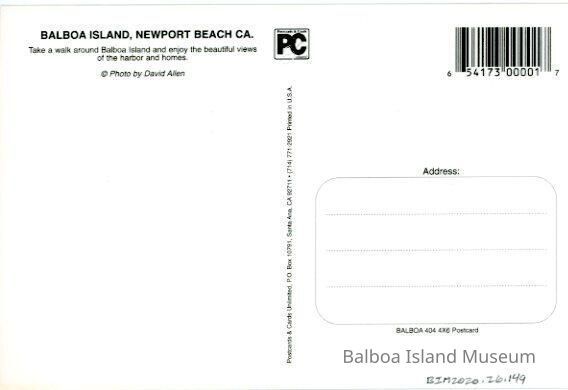 Two copies of a color photograph postcard of several homes along the bay front with flowering gardens. The photograph was taken in front of 1008 South Bay Front and looks down the boardwalk towards 1000 South Bay Front. Both unused. The back has a barcode instead of a stamp box. There is a watermark of a surfer on his board on the back. Published by Postcards & Cards Unlimited in Santa Ana. Photograph by David Allen. Designed by Rich Harris. Printed in the U. S. A. Number Balboa 404.Subject