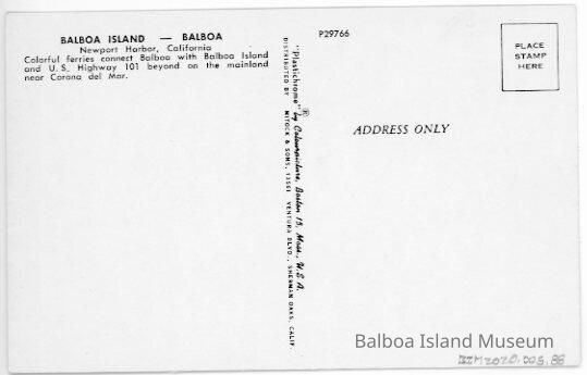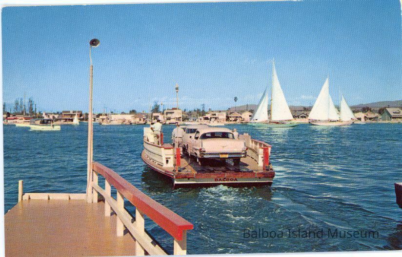 A photograph postcard of the Balboa Island Ferry pulling away from the dock and heading towards the Balboa Island dock.A pair of larger sailboats are also sitting in the harbor, heading in a cross path with the ferry.