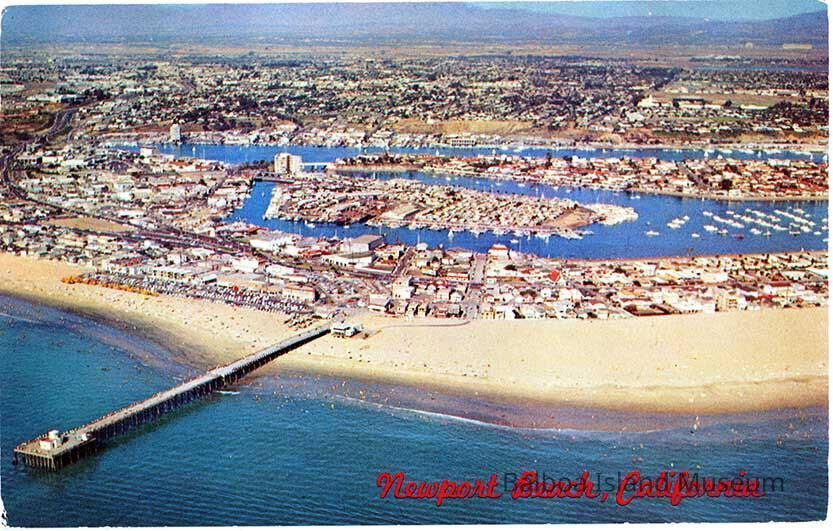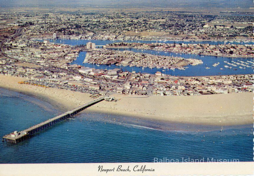 Two slightly different copies of a color aerial photograph of the Newport Beach Pier and Newport beach area with Lido Peninsula and Lido Island behind it. One is larger, 4" x 5.75", and one is 3.5" x 5.5". The larger one has a scalloped edge and a white banner along the bottom with the title. the smaller one has the title written in cursive script in red along the bottom right corner.