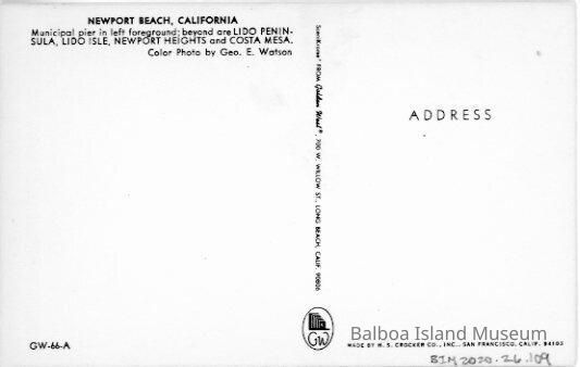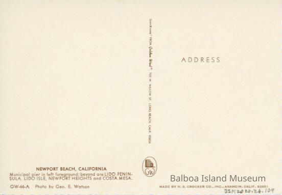 Published by Golden West of Long Beach. Printed by H. S. Crocker Co., Inc, once in San Francisco and one after they moved to Anaheim. Photographed by George Elton Watson. Postcard number GW-66-A.Subject