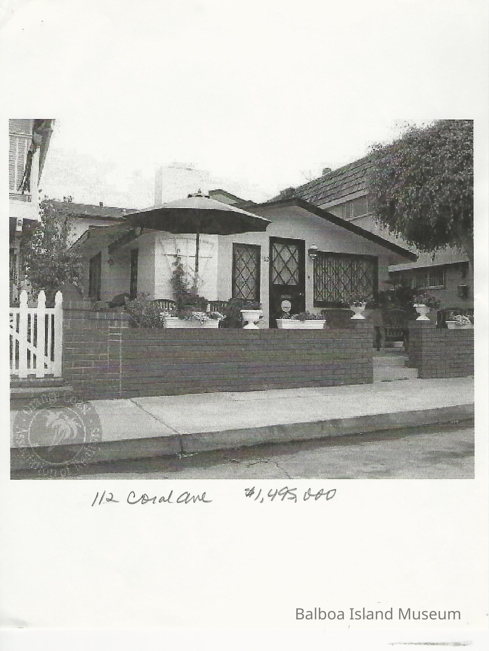 A photocopy of a black and white photograph of 112 Coral Avenue. The price is noted as $1,495,000.Lexicon