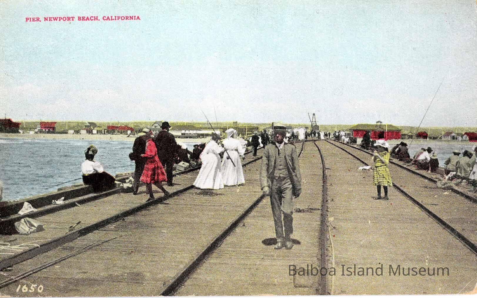 A colorized image of the Newport Beach pier looking towards the shore, taken from close to the middle of the tracks. There are people on both sides of the pier fishing and a man walking down the middle of the tracks. Loading equipment is visible near the shore but there are no trains or cars. Photograph number 1650.