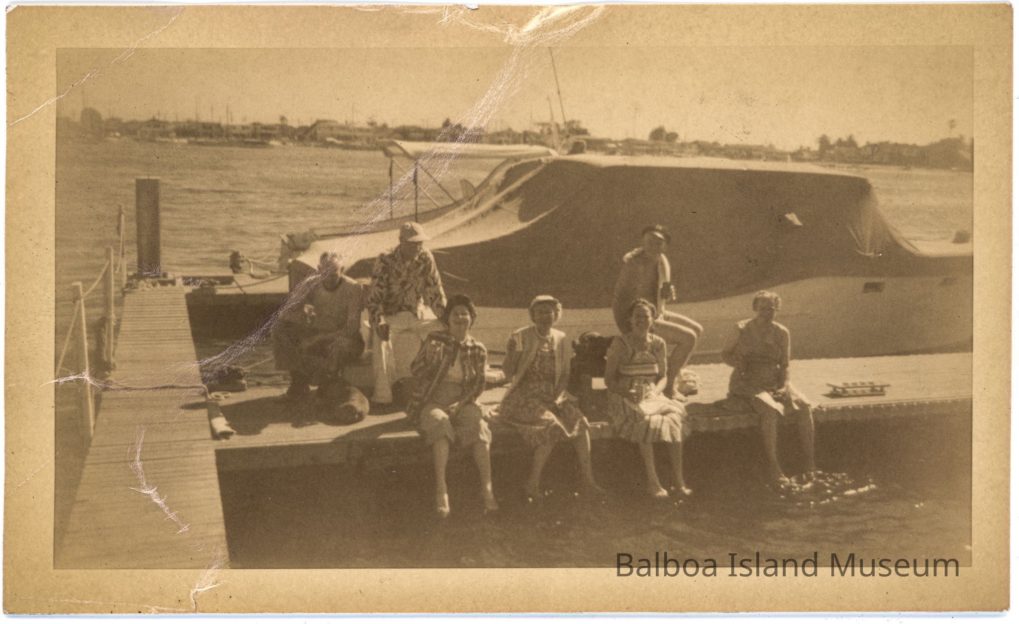 photo of family and friends lounging on the Collins Island dock with the peninsula in the backgroundPhotograph Details