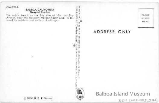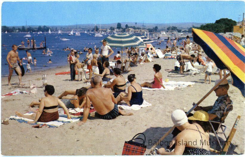A colored postcard of beachgoers on the stand inside the harbor along the Peninsula side. West of Newport Harbor Yacht club at 10th Street and Bay Avenue.