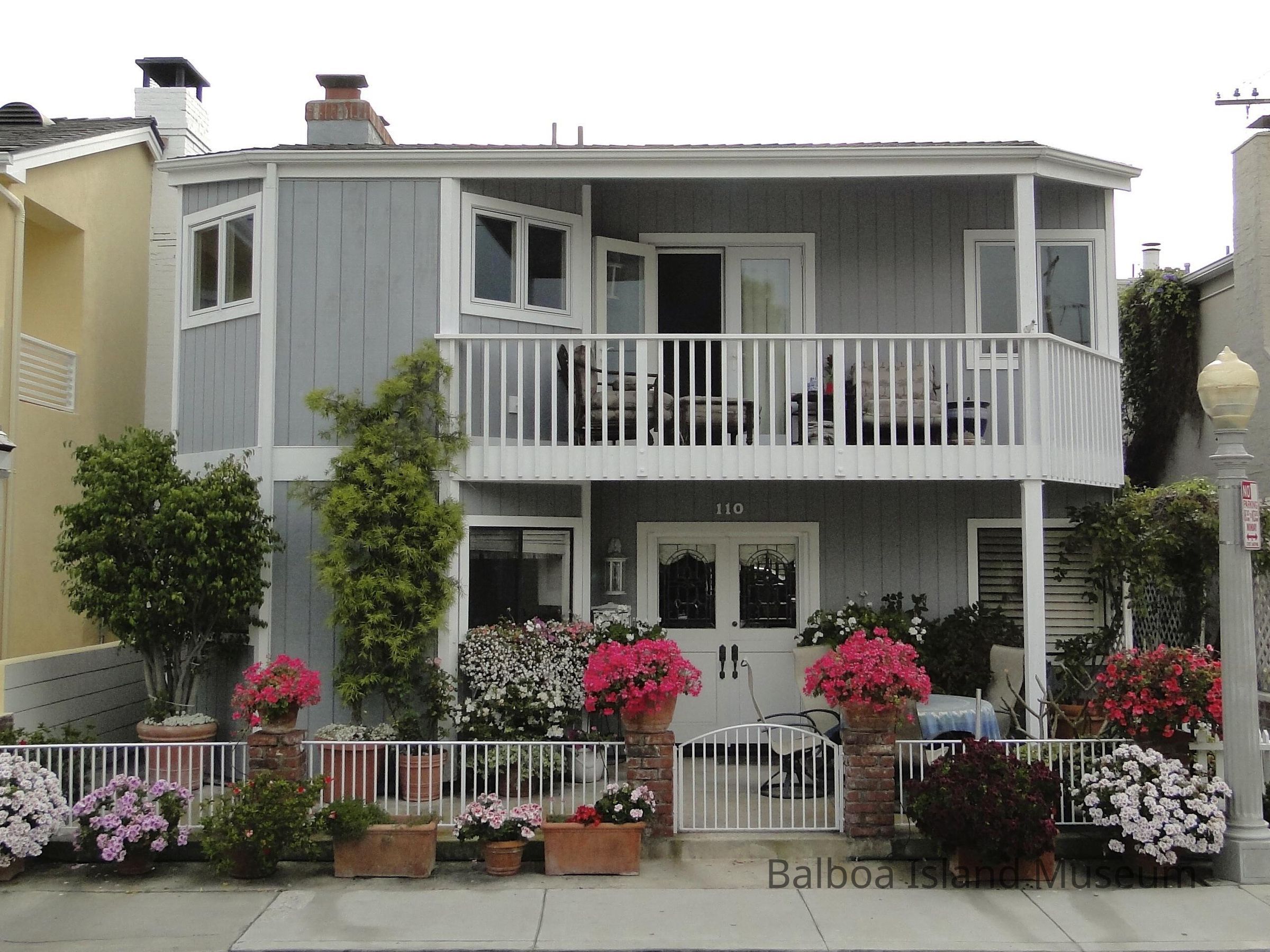 It has two stories that are identical in appearance except for the doors- the first story has French doors and the second has sliding doors. The second story has a deck with a vertical wood bar railing. The building is covered in vertical planks painted grey with white trim. The walls on the left side of the building are all angled, creating a half hexagon shape on the left side of the building.Made/Created