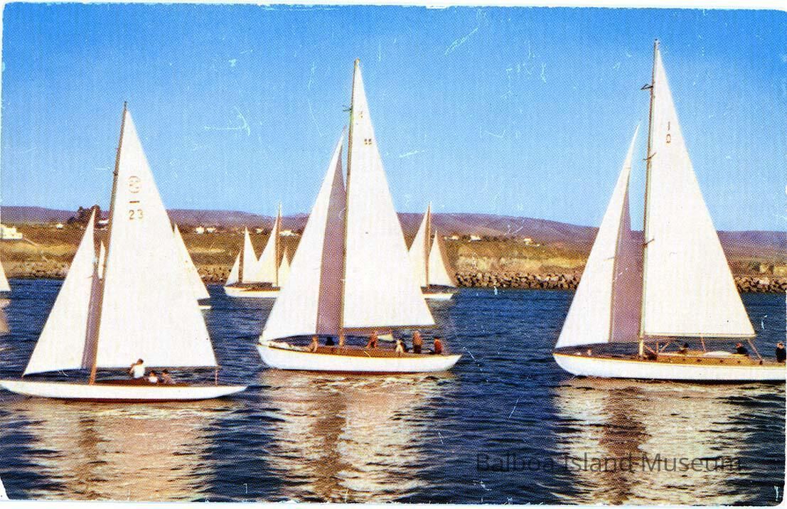 A color postcard of three sail boats on the harbor with the hills and more sailboats behind them. This might be from one of the snowbird or other various harbor sailboat races.