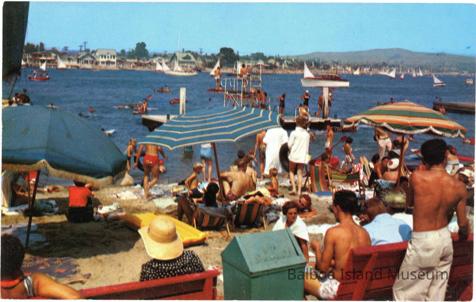 A color photograph of people crowded on the beach at the fun zone watching divers on the platform in the water. The image is slightly blurry.