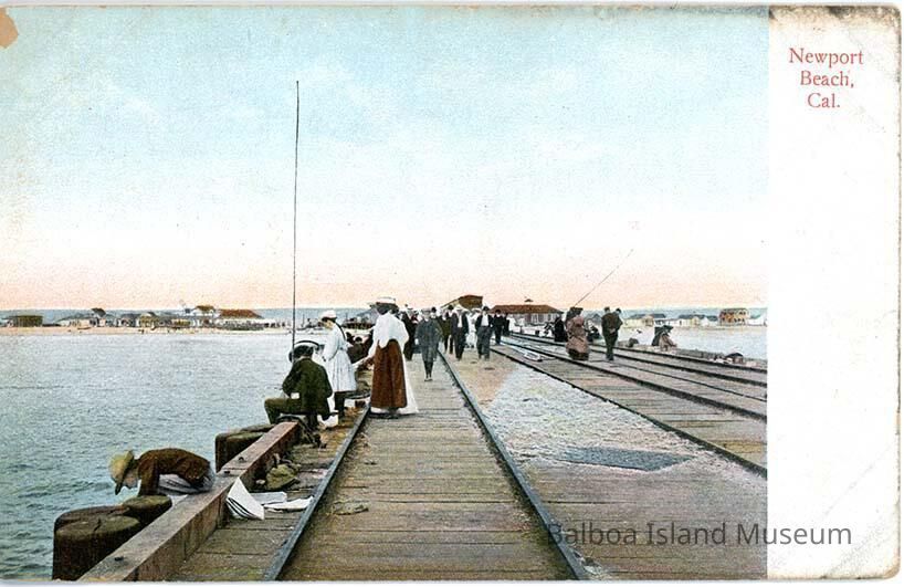A colorized photograph of the Newport pier looking towards the shore. Railroad tracks are still visible. The photograph was taken from pretty far out on the pier. There is a white banner on the right with the title "Newport Beach, Cal".