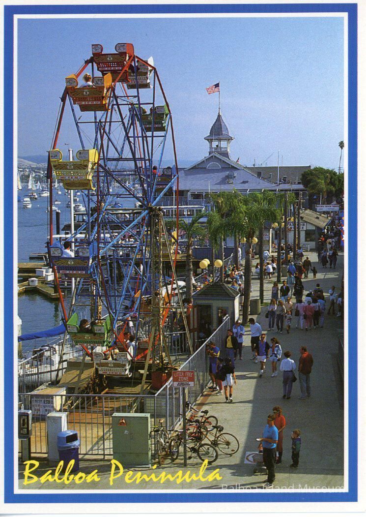 A color postcard vertically printed with a photograph of the Ferris Wheel and Balboa Pavilion behind it.