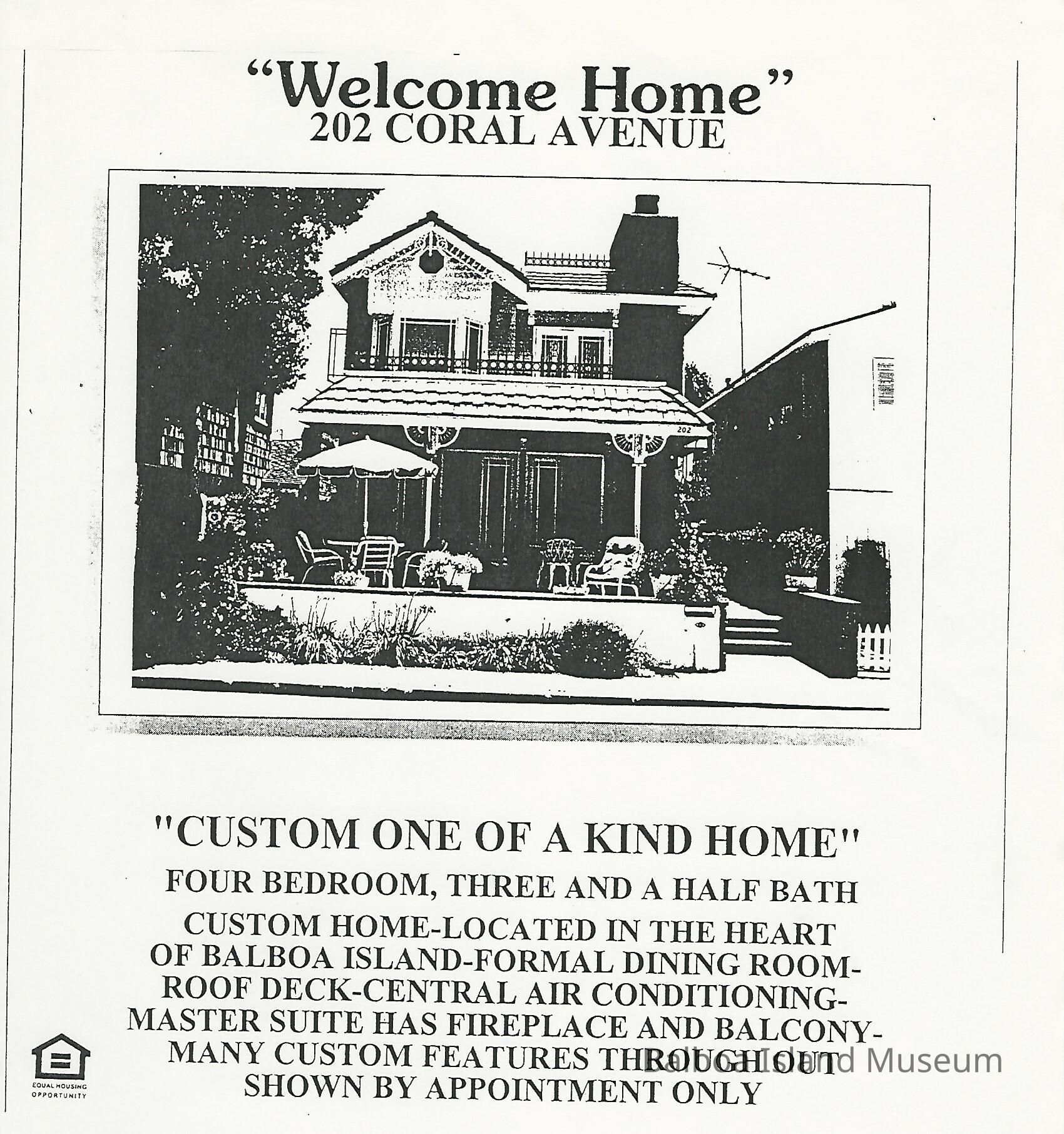 A black and white photocopy flier advertisement for 202 Coral Avenue. This was the second house on the property. The photocopy is of poor quality. The test touts it as a "custom" home and notes it is shown by appointment only.Lexicon