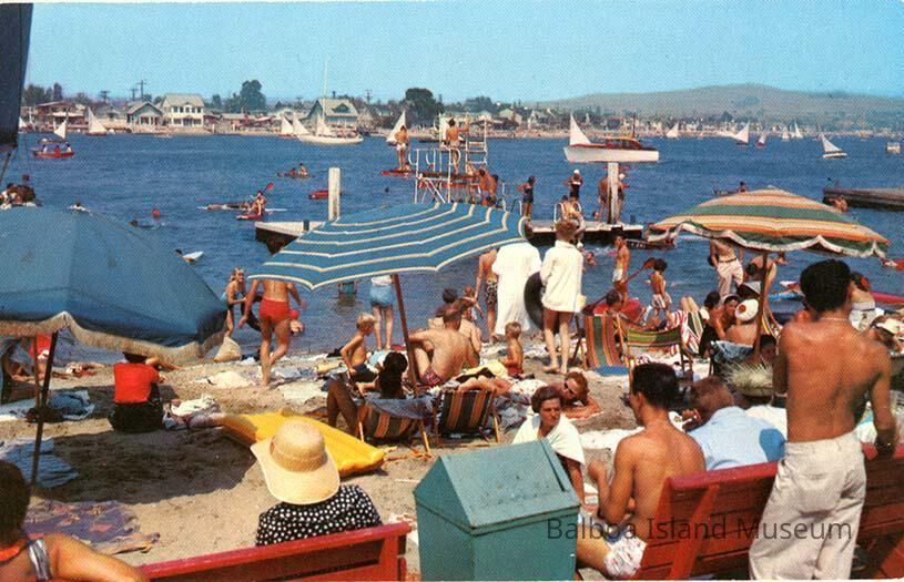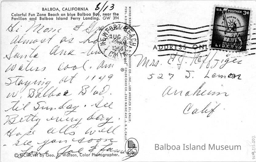 A photograph postcard featuring a shot of a beach along the Balboa Fun Zone. It shows the diving platforms, beach goers, and a shot of South Bay front around Topaz avenue. The postcard was sent August 1958 to a Mrs. E. J. Hoffsiger in Anaheim California. The phtoograph was taken by Geo. E. Watson in 1957. The title is Balboa, California: Colorful Fun Zone Beach on blue Balboa Baym near the Pavilion and Balboa ISlanf Ferry Landings. GW 394. It was pbulished by Golden West. The card was made by H. S. Crocker Co, Inc.Lexicon