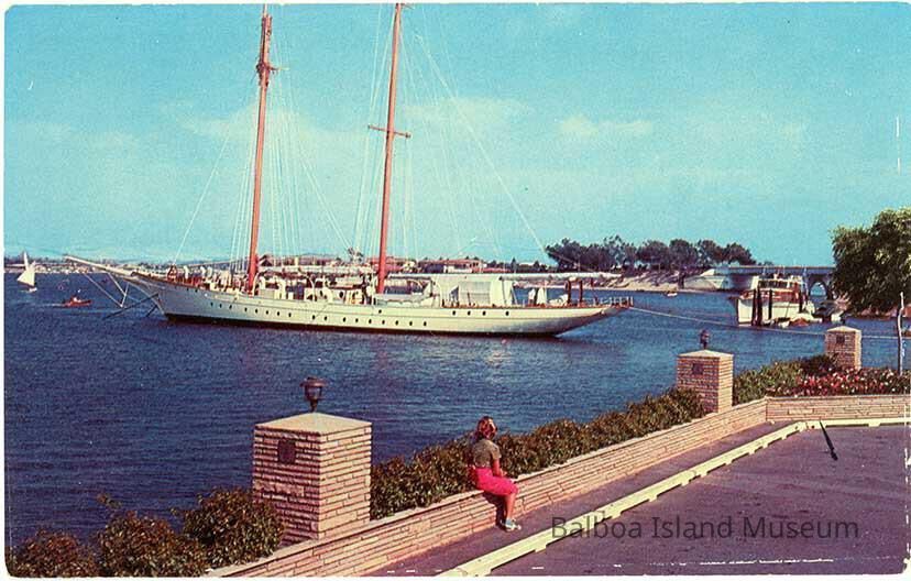 A color postcard of a woman or girl sitting on a wall looking out at a large sailboat in the harbor. Near the PCH bridge.