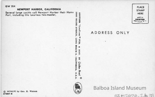 Published by Golden West in Long Beach. Printed by Dexter press in West Nyack. Photograph by George E. Waton. Postcard number GW 354. Postcard printer 47697-B.Subject