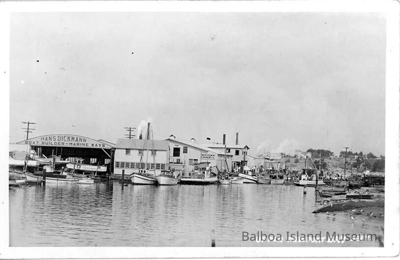 A historic postcard showing the Hans Dickmann Bot Building dock and the cannery area. Visible are signs for Hans Dickmann's shop and Western Canners. The beach is visible on the left where painters like Helen Smith would have worked. The back is a simple, generic postcard form. The stamp box has the initials EKC, which might be the manufacturer of the card.Lexicon