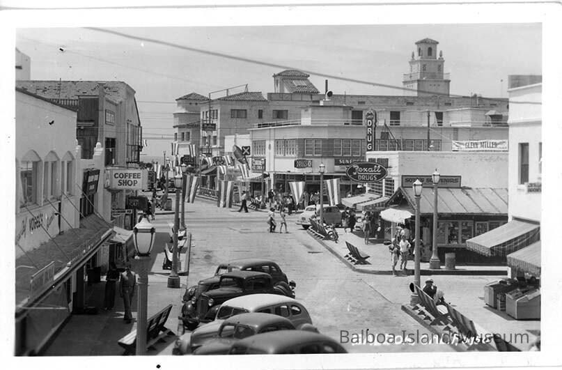 A picture postcard featuring a photograph looking down Main Street, Balboa towards the ociea. The building on the left with the big coffee shop sign is now the post office and the one next to it, once a casino and cafe, is now a retail store. The post office building appears to have been torn down between this photograph and now. The building to the right of it as well as the pharmacy on the corner across the street are both still there. The small building housing Soto's Souviners beside the pharmacy is either gone or heavily remodelled. Most of the other buildings are still there, save the Penny Arcade building which was demolished. There is now a parking lot in that location.