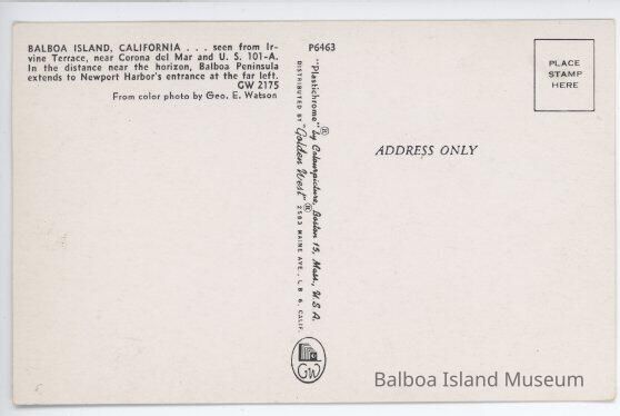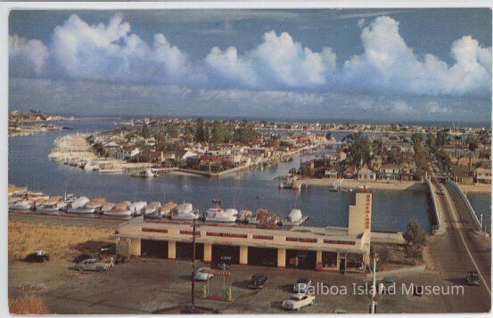 A photograph of the island and the Broerings service station taken from the top of the hill at Promitory point. It would have beent aken close to where Jamboree meets PCD. the bridge is also visible. The photograph appears slightly blurry, either from the quality of the photograph or the printing. Full color.Subject