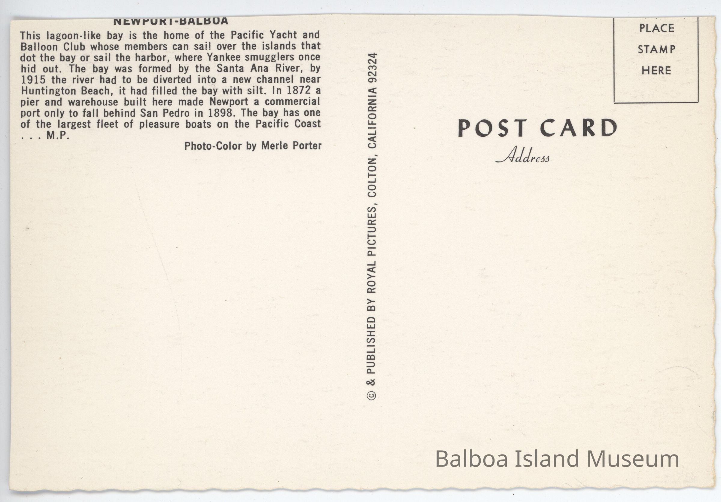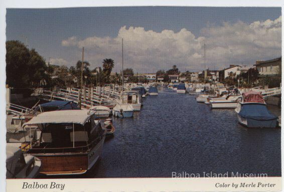 A photograph postcard featuring an image of several docks along a long channel with houses at the other end. This post card is identified as Balboa Bay, though it is most likely the are directly around Newport Island in the photograph due to the strage nature of the channel, which does not occur in the Balboa area except along Grand canal and the doc types do not match Grand Canal.