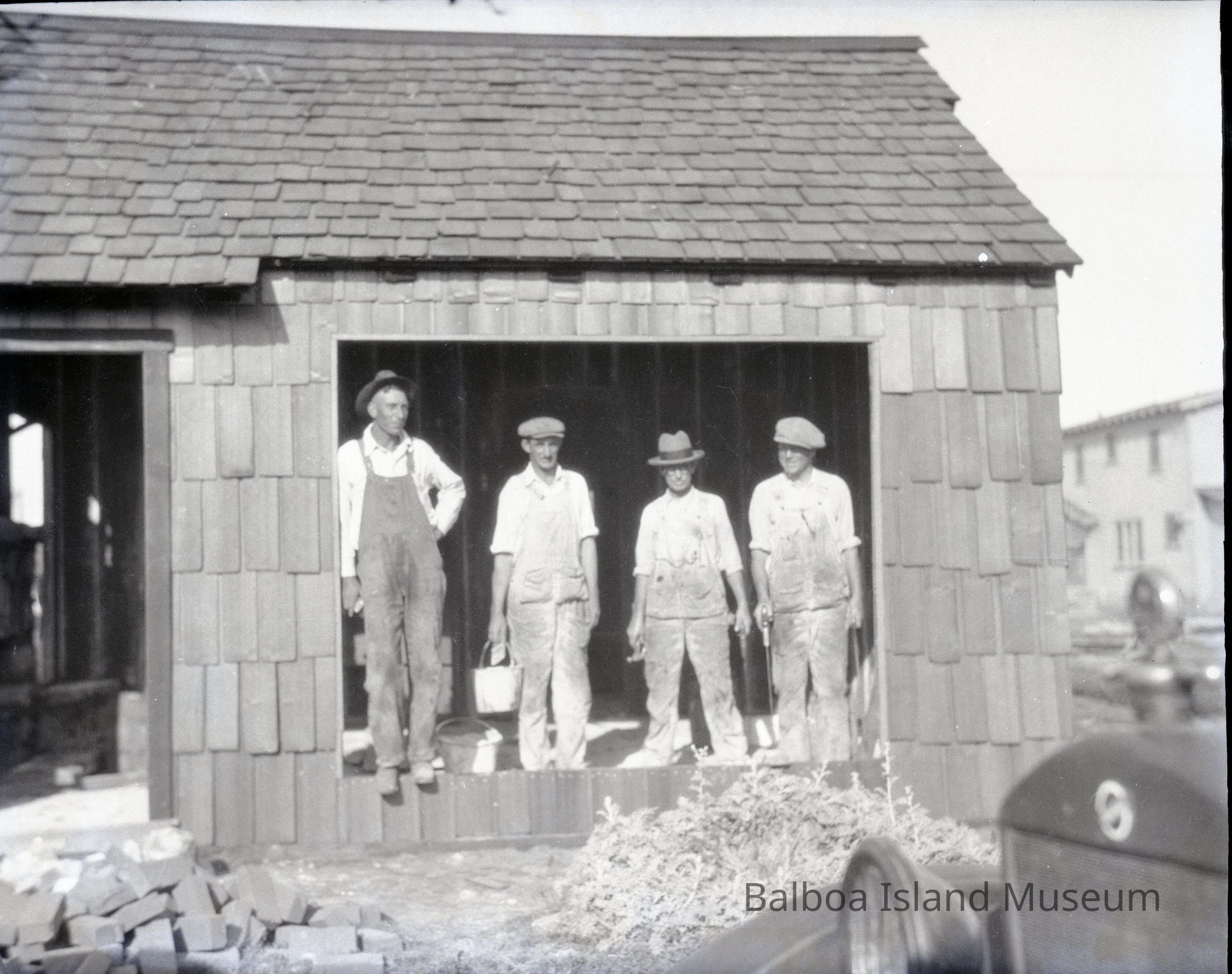 A negative of an image of four men standing in an open window space of the Hal Will Realty Office at 205 Marine Avenue.