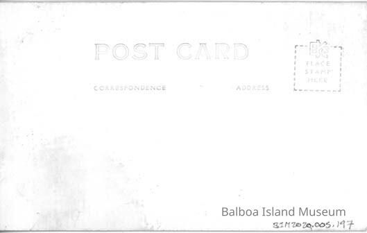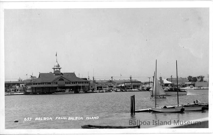 A black and white photograph postcard of the Balboa Pavilion from Balboa Island with an electrical shop and the fun zone visible to the right, namely the Carousal but no Ferris wheel, and what might be a ship yard to the left. The harbor master tower is just behind a sailboat. The photograph was probably taken from around 526-530 South Bay Front.