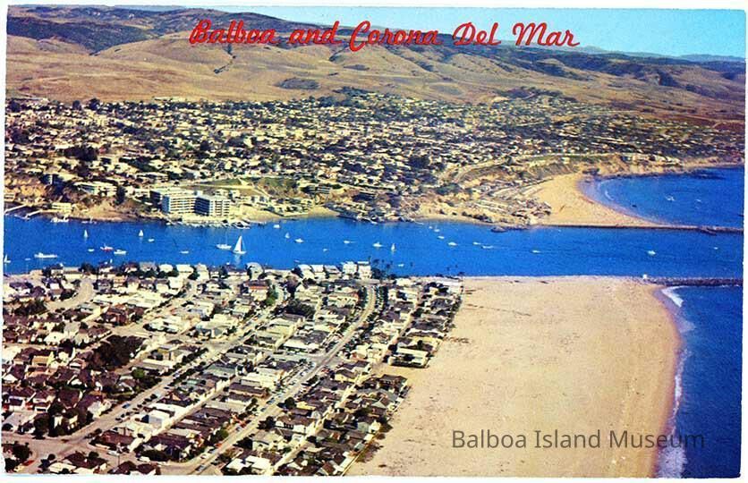 A color postcard of the Newport harbor entrance taken from the air above the Peninsula beach. The harbor entrance cuts across the middle of the image with the beaches on the right and the neighborhoods on the left.