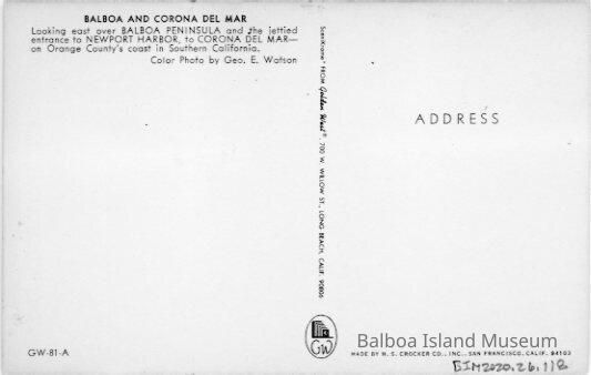 Published by Golden West in Long Beach. Printed by H. S. Crocker Co., Inc in San Francisco. Photograph by George E. Watson. Postcard number GW-81-A.Subject