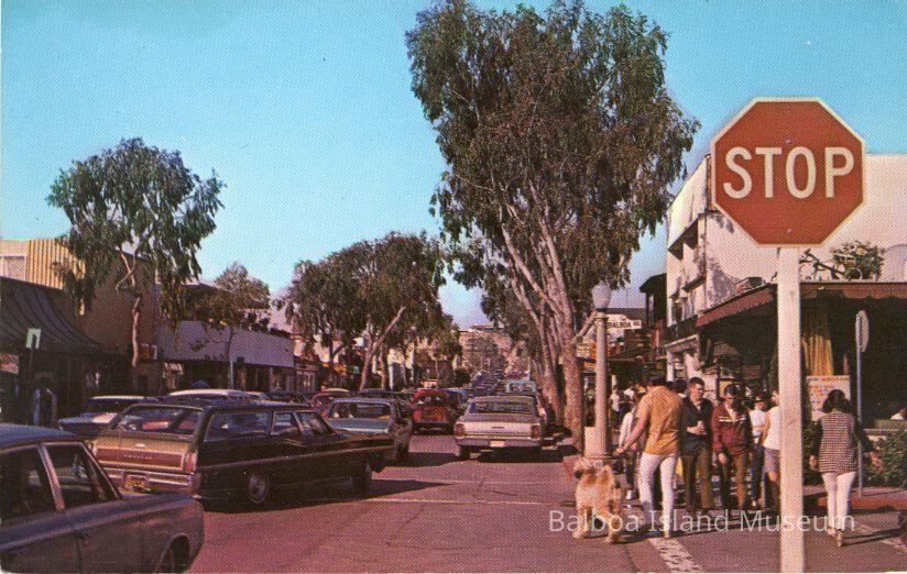 A color photograph postcard looking up marine towards Irvine Terrace along the 300 block. Taken from the right side of Marine with Jamboree plaza visible across the way. Taken at the stop sign in front of what is now Starbucks.