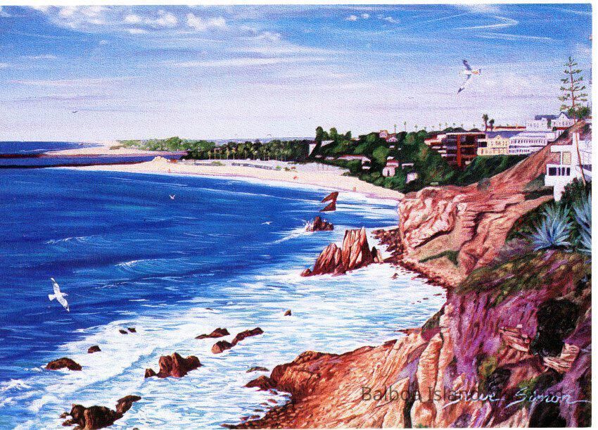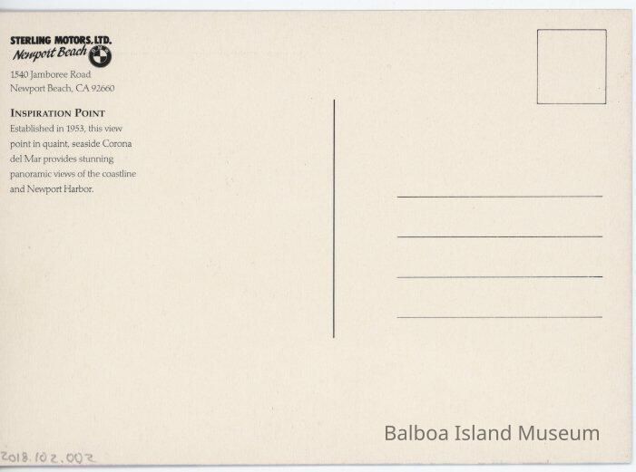 A large 5" x 7" postcard from a set released by Steve Simonfeaturing images of Newport beach. The painting on the front featuresan image from Inspriation Point at the end of Corona del Mar looking in the direction of the Harbor entrance. There is an advertisement for Stearling Motors, Ltd in Newport Beach on the back.Lexicon