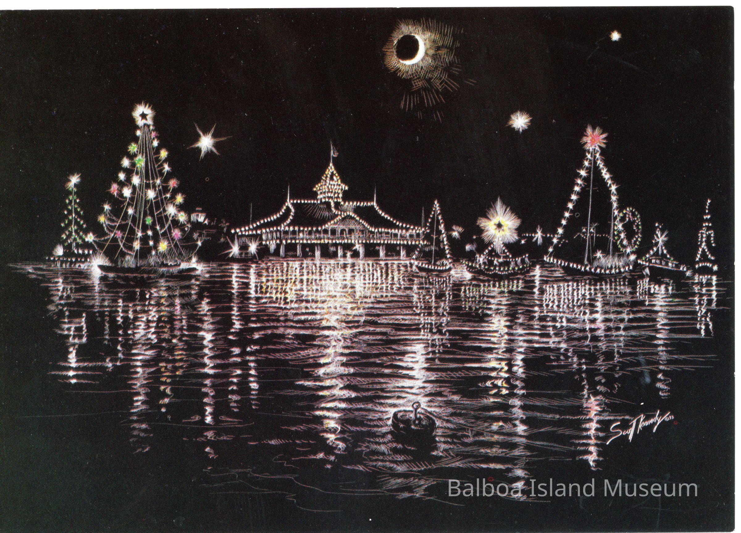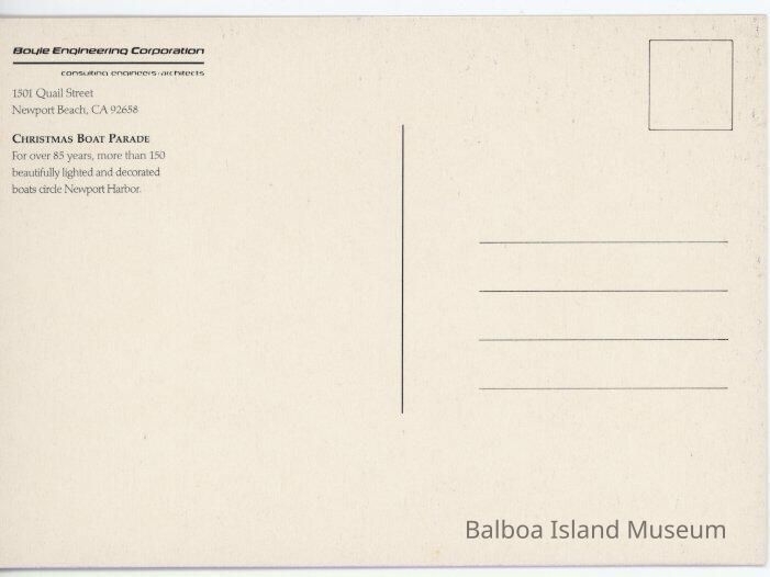 A large 5" x 7" postcard creation by Scott Kennedy as part of a Newport Beach postcard series. The image features a painting of the Christmas boat parade in front of the Pavilion. The back has a small location note and an advertisement for the Boyle Engineering Corporation in Newport Beach.