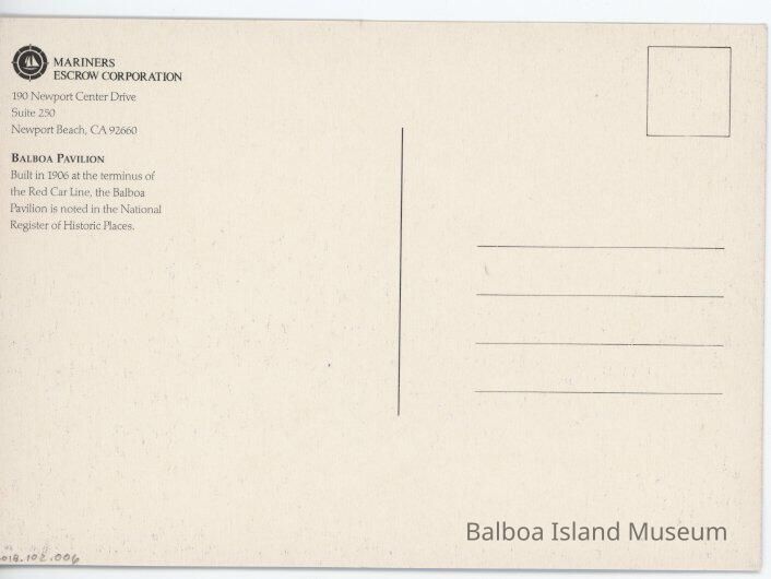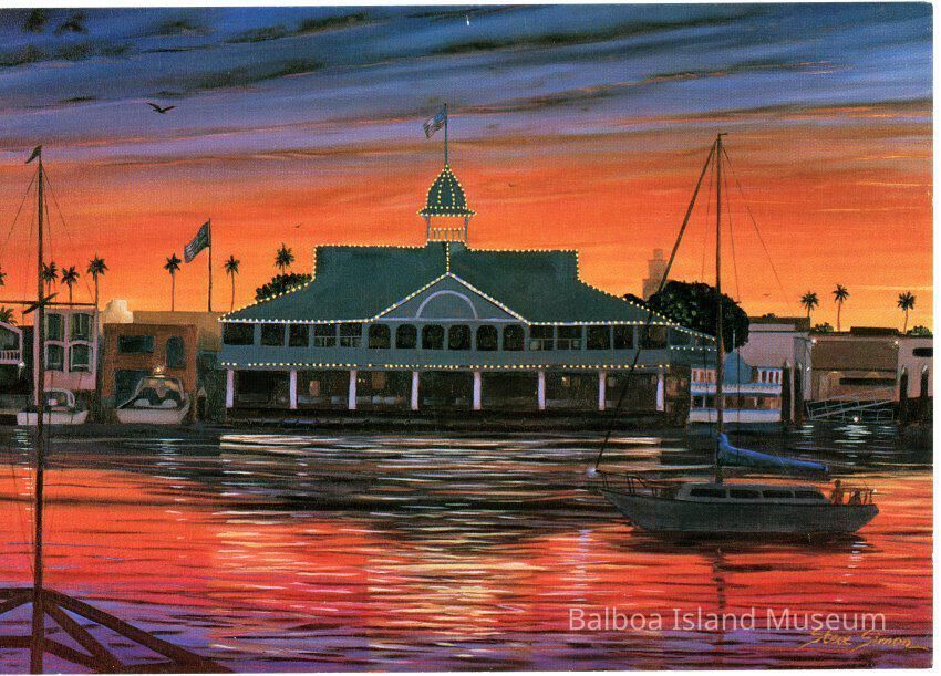 A large 5" x 7" postcard created by Steve Simon as part of a newport Beach postcard series. The image features a painting of the Balboa Pavilion at sunset with the lights that outline the pavilion lit. That bak features a little history about the pavilion and an advertisement for the Mariners Escrow Corporation.
