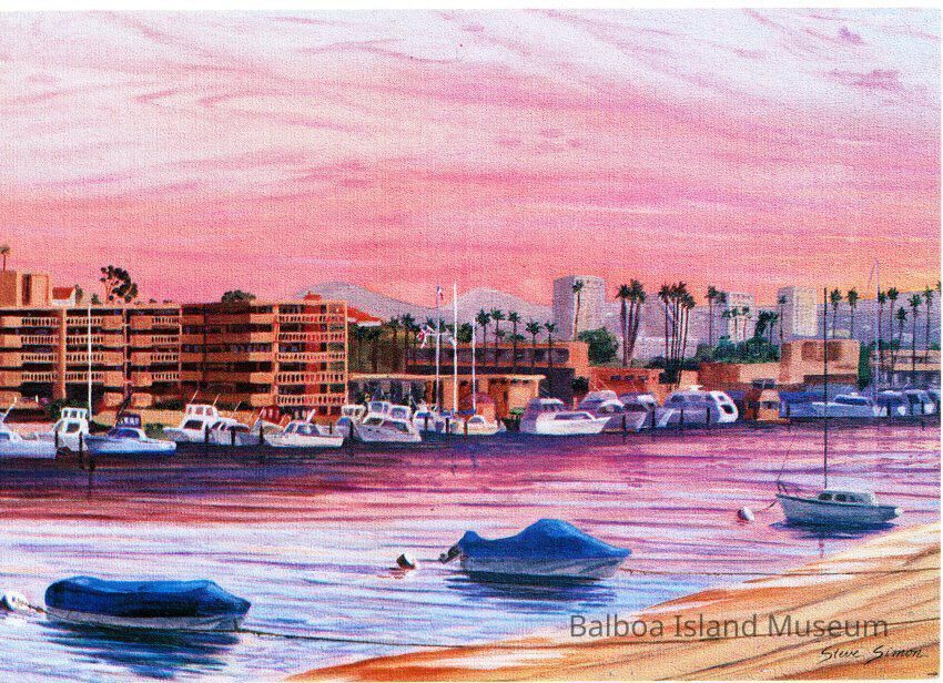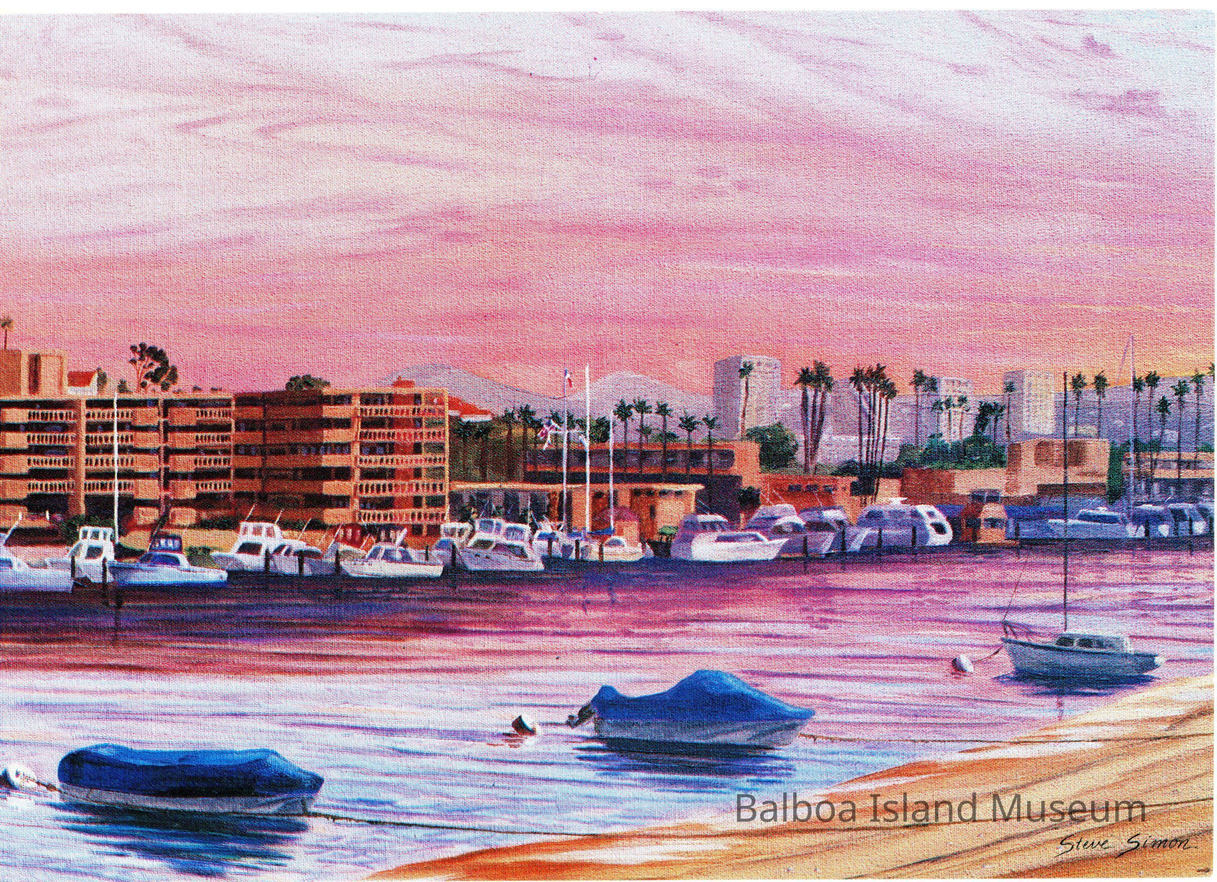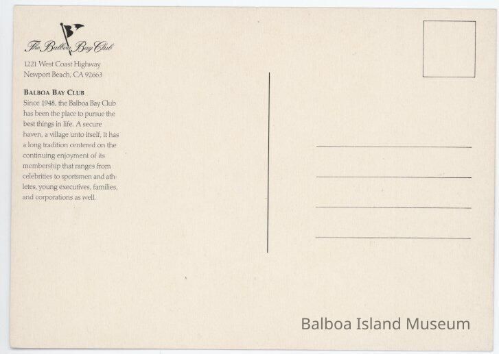 A large 5" x 7" postcard created by Steve Simon as part of a Newport Beach postcard series. The image features a painting of the Balboa Bay Club and neighbooring buildings along with some of the Fashion Island officeb uildings in the background. The painting was don from the opposite shore to the Bay Club. The back has a small location note and an advertisement for the Balboa Bay Club.