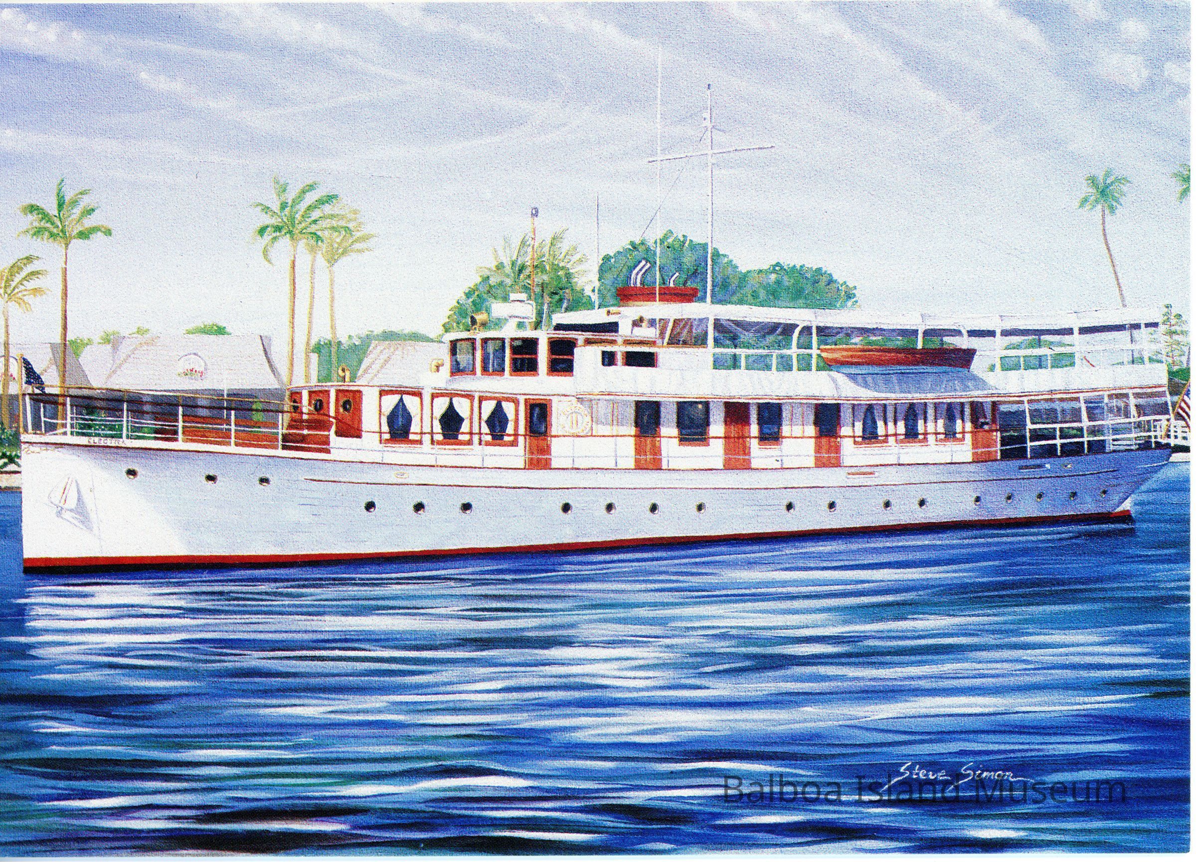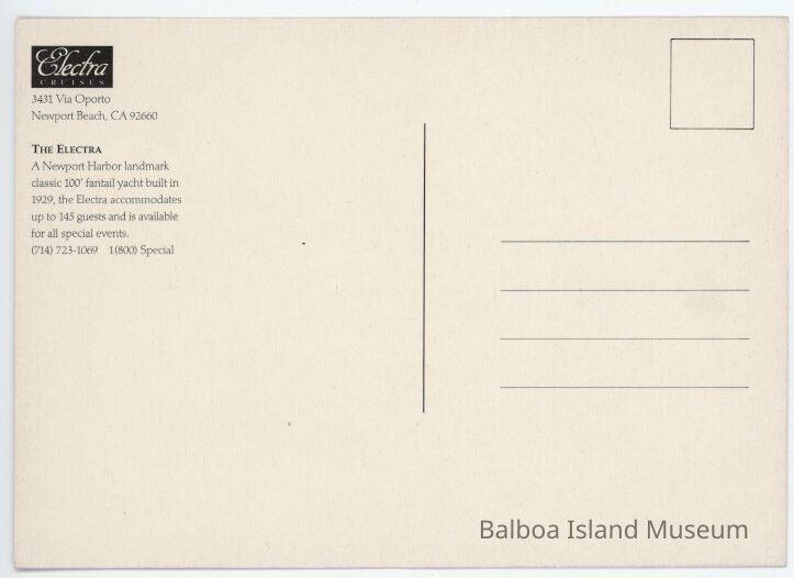 A large 5" x 7" postcard created by Steve Simon as part of a Newport Beach postcard series. The image features a painting of the Electra, a 1929 boat available for rent in the Newport bay. It is white and brown and the back describes it as a 100' fintale. The back has a small location note and an advertisement for Electra cruises.