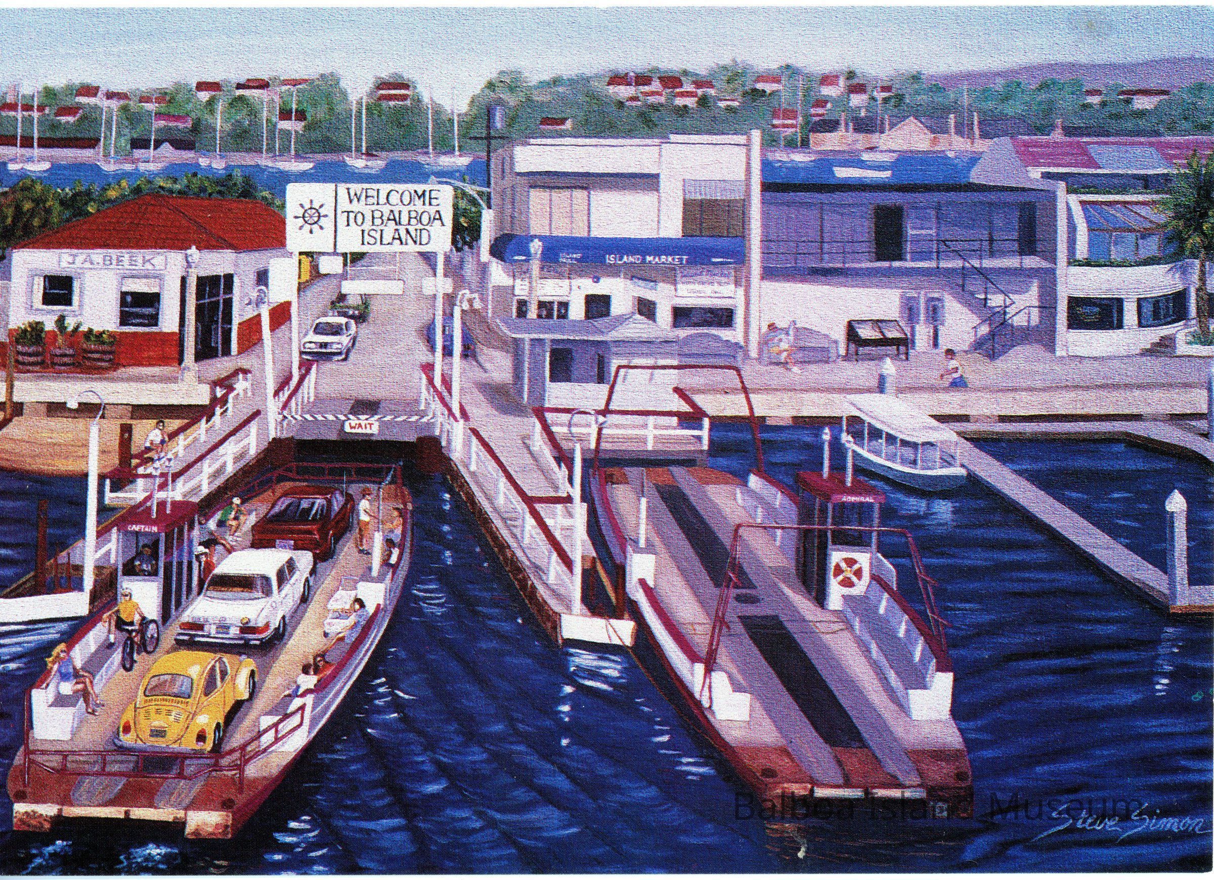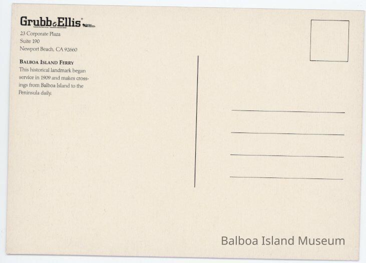 A large 5" x 7" postcard created by Steve Simon as part of a Newport Beach postcard series. The image features a painting of the Balboa Island Ferry pulling into the Balboa island dock. The painting is done from about fifty feet above the water. there is a second ferry, not in use, docked next to it in front of the island market. The back has a small location note and an advertisement for Grubb & Ellis.Lexicon