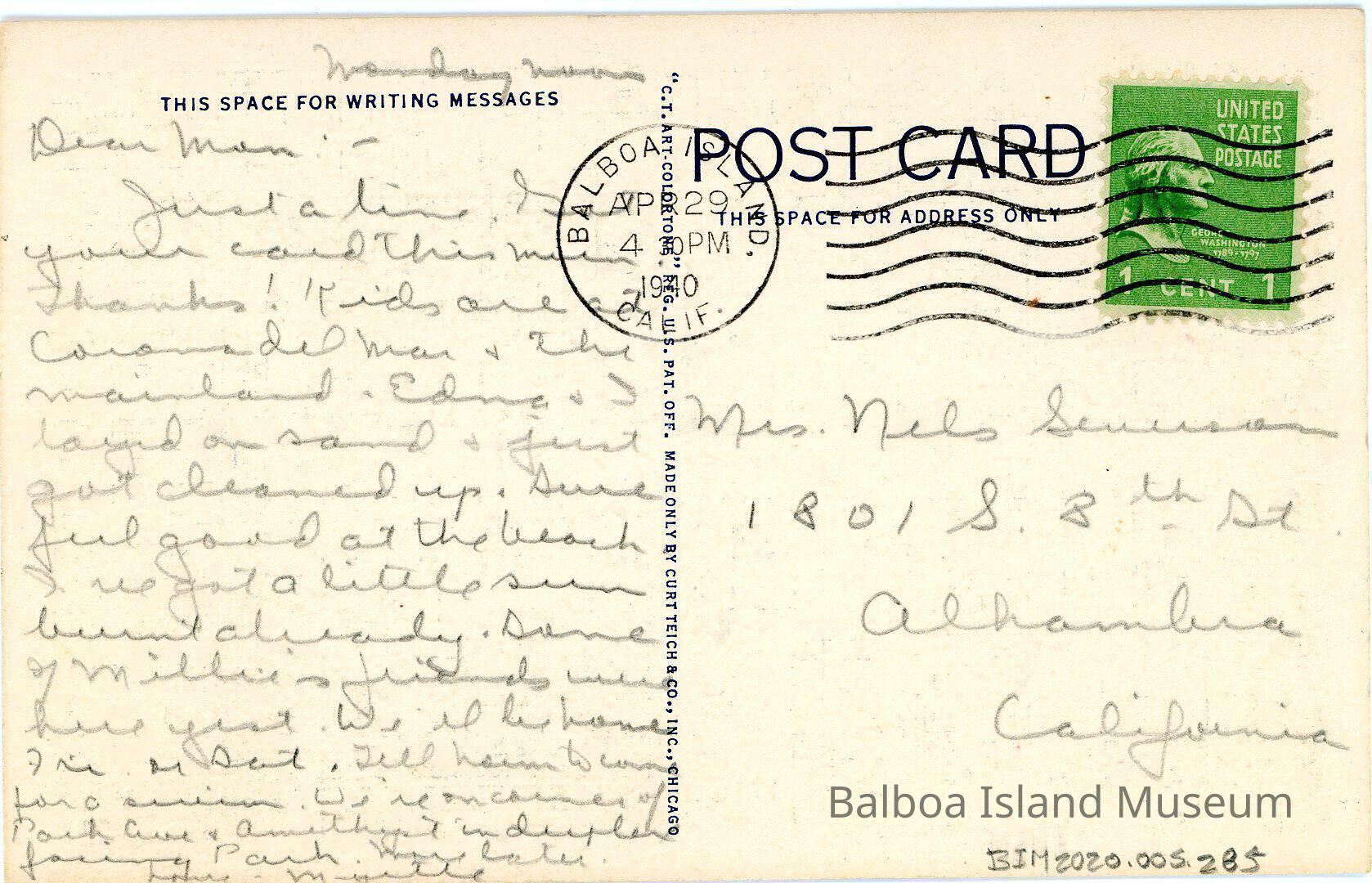 Sent on April 29, 1940 from Balboa Island to Alhambra California. Sent by Lily [-----] to Nels Seurson.